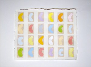 A lot of ideas, feelings, and images keep me company as I work. Recently, one of those ideas wiggled its way past the others and firmly called for a softer, warmer statement rather than the geometric shapes and hard angles I had been working with. Keeping the grid, and keeping things simple, I settled on an embryonic shape and softer color.