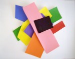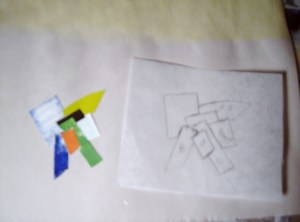 The question has been how to secure the pieces precisely without the edges of the paper underneath the uppermost pasted cutout becoming embossed. (I think I stated that right.) I also didn’t want to lose the energy, the assertiveness of the unpasted pieces. After days of just looking at them and picturing them in my mind’s eye with no accompanying vocabulary, the answer arrived the other day. Sometimes simple solutions take a long time to debut.