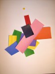 After I laid out the newly cut pieces, I tried adding some other pieces: a quiet light blue here, bigger cerulean blue rectangles here and there. What about a magenta piece right here? No. How ’bout orange? Red overlapping pieces? Nope. The added pieces decreased the dynamic of the original instead of pumping it up. The arrangement became blob-like. It was a back-to-square-one moment. A return to the scene where the total visual impact seemed to hold…well, possibility at least.