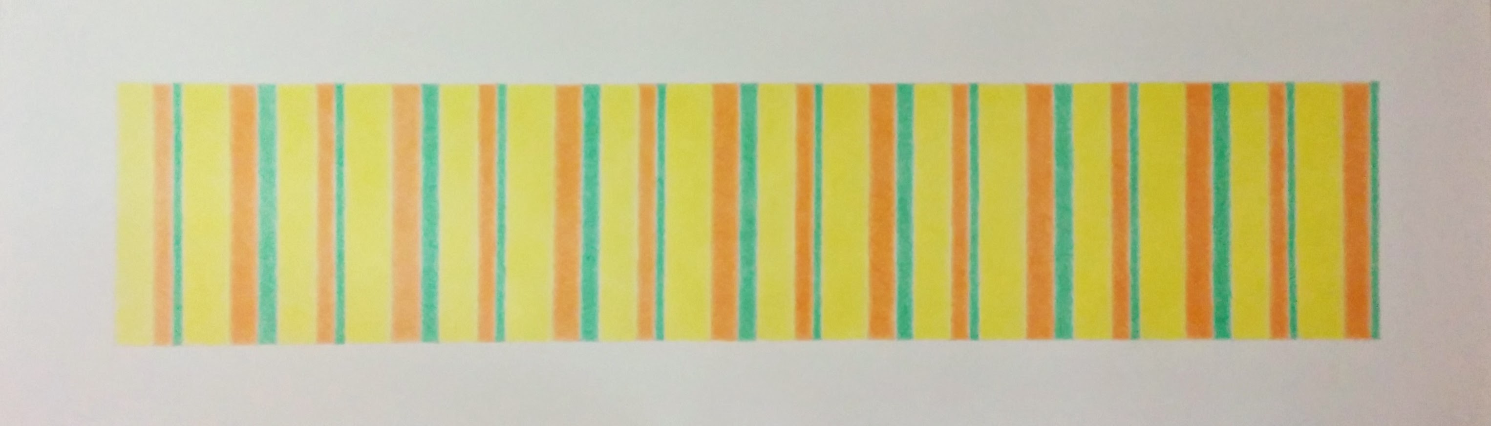 Using color pencil I outlined a wide horizontal band on a long sheet of paper. I then drew a repeating pattern of stripes with alternating widths for each color. The intent was to create a receding and advancing line of stripes moving across the paper. I was in pursuit of a gentle flow of movement relying on the repetition of color and stripe width.