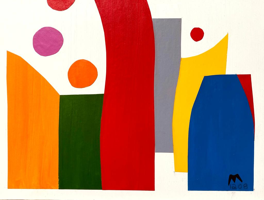 The annual end-of-the-year members’ exhibition at Da Vinci Art Alliance here in Philadelphia called for responses to the word light. Thinking of this holiday season under a word umbrella of light, my immediate thoughts jumped from religious scenes to starry night skies to festive Christmas lights, and then landed on a collage I created years ago that was part of a series entitled “Family.” These collages included arrangements of cut pieces of acrylic-painted paper on board offering different relationships of color, shape, size and placement. One work in particular stood out as expressing my current inner dialogue with the word light.
