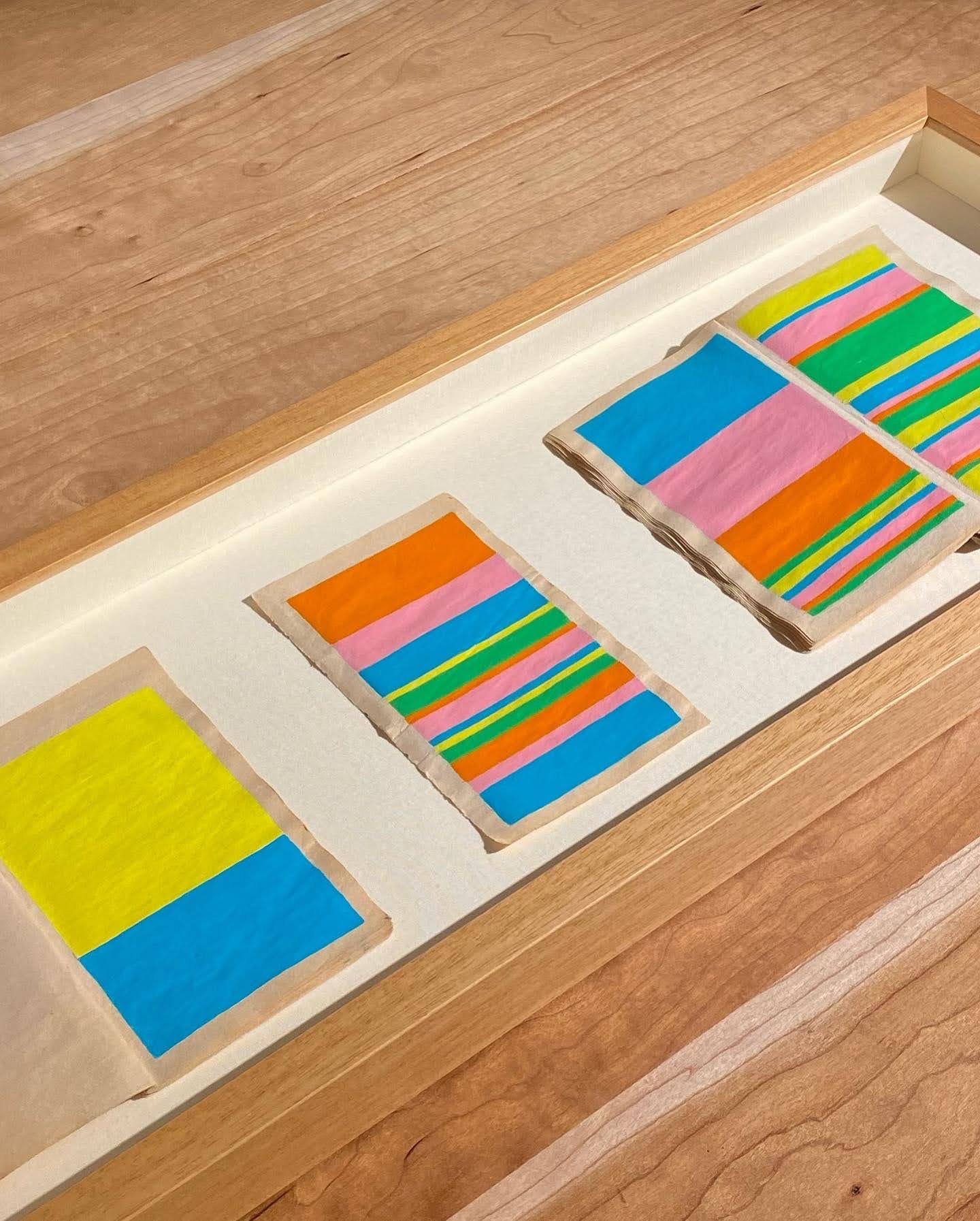 If I stood in the center of the room and spun around, the colors would circle around me like friends It was an installation! Paintings on the wall, frames, display case, video, artist's book, torn used paperback cover, painted paperback page, and music An original composition Video with my original composition A bench The red page (the seed) The four sections of the Untitled used paperback in-progress that had come apart displayed in a case (for me). Special. "Be tender" it says. The color dispersed in the space creating its own air, along with the music. The space held the art and music. Was art itself.