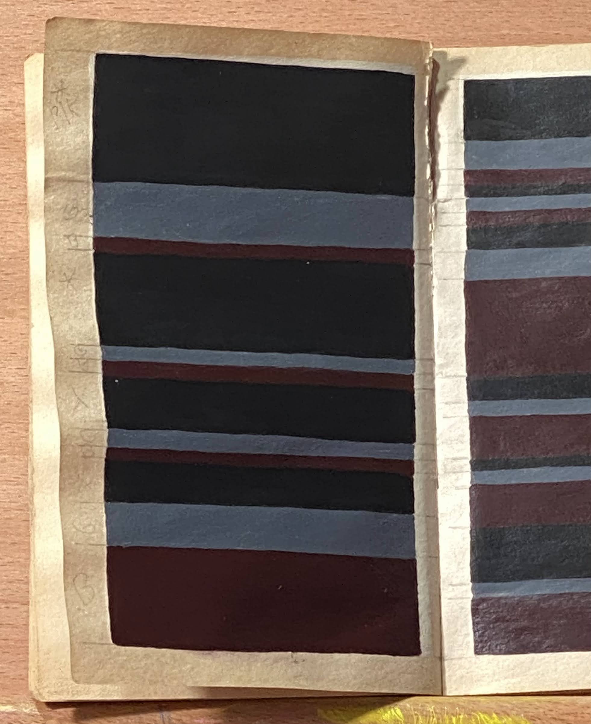 and still, I’ve been working on it for years. It is the used paperback mystery I am altering by painting over each paragraph turned into a rectangular block. I have about 8 more chapters to go. First, each block is marked with pencil. Then the pages are painted with coats of titan buff. The tops and bottoms of each rectangle are then remarked with pencil and checked for being parallel to the book’s top and bottom. After noting the repeating color next to each block, the painting begins, which usually requires 2 coats if not more. The process repeats for each chapter. Any changes are with the small groups of chosen color as I reflect on, respond to, and add on to an evolving visual story.